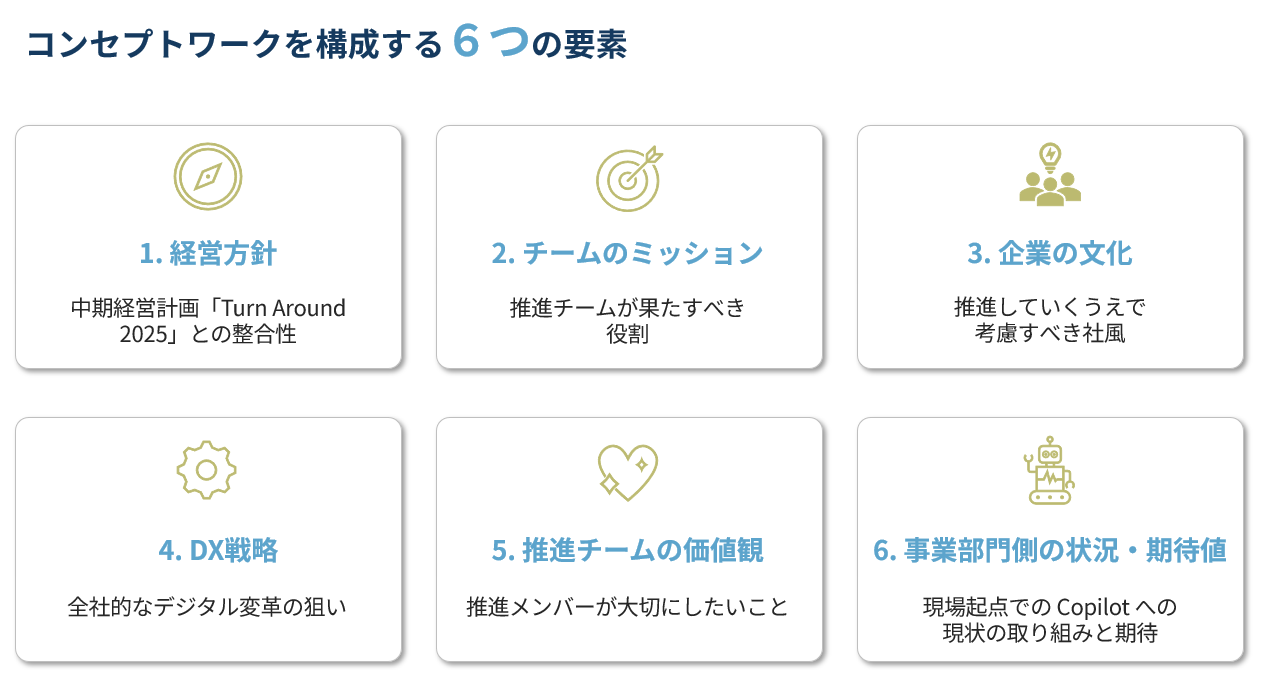 Copilot の全社展開を成功に導くためには、単に AI ツールを導入・活用すること自体が目的ではなく、経営方針や全社的なデジタル変革の実現に向けた施策の一環であるという認識を、すべての利用者に共有することが重要です。この考えのもと、本コンセプトワークでは「翌年度に実施する全社展開トライアルに向けたゴール」を明確化し、推進チームの全メンバーがその目的と方向性を共通認識として持つことを目指しました。