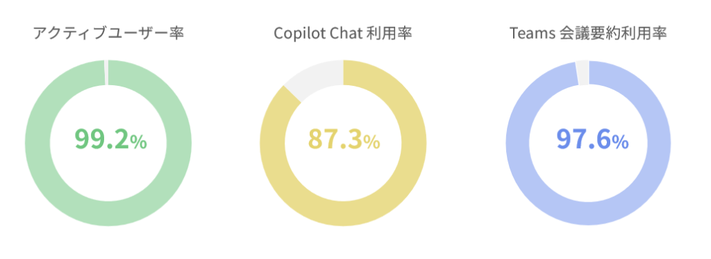 これらの支援により、部分導入フェーズにおいてアクティブユーザー率:99.2%、Copilot Chat 利用率:87.3%、Teams 会議要約機能利用率:97.6% という極めて高い利用実績が得られました。この結果は、短期間で Copilot が日常業務に定着し、業務効率化と生産性向上に大きく寄与していることを示すものです。