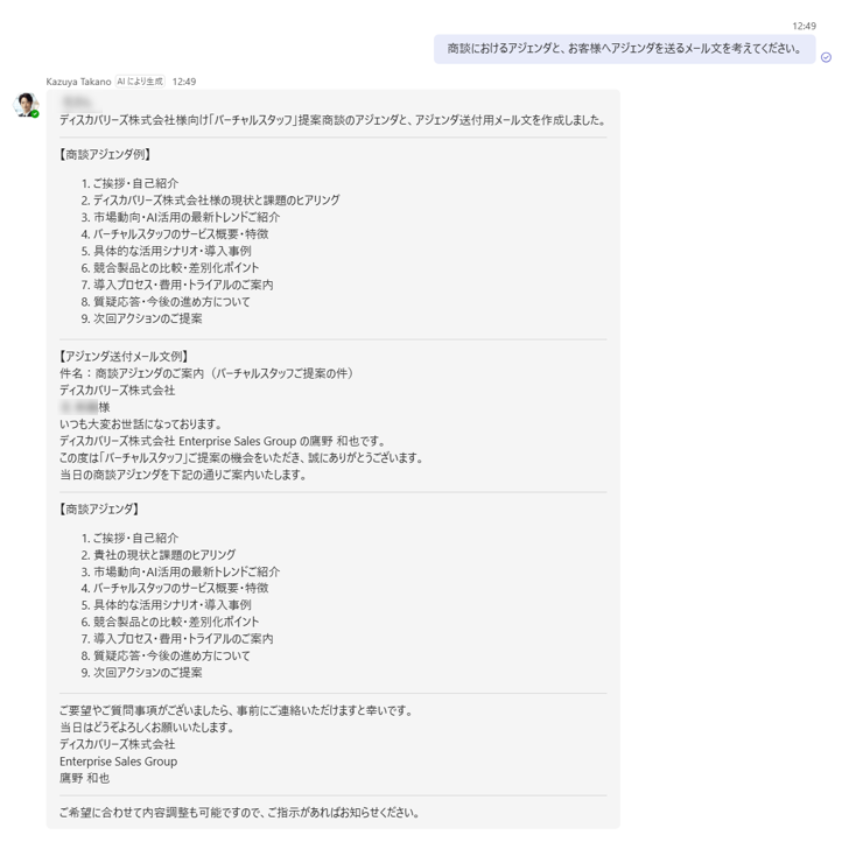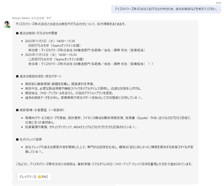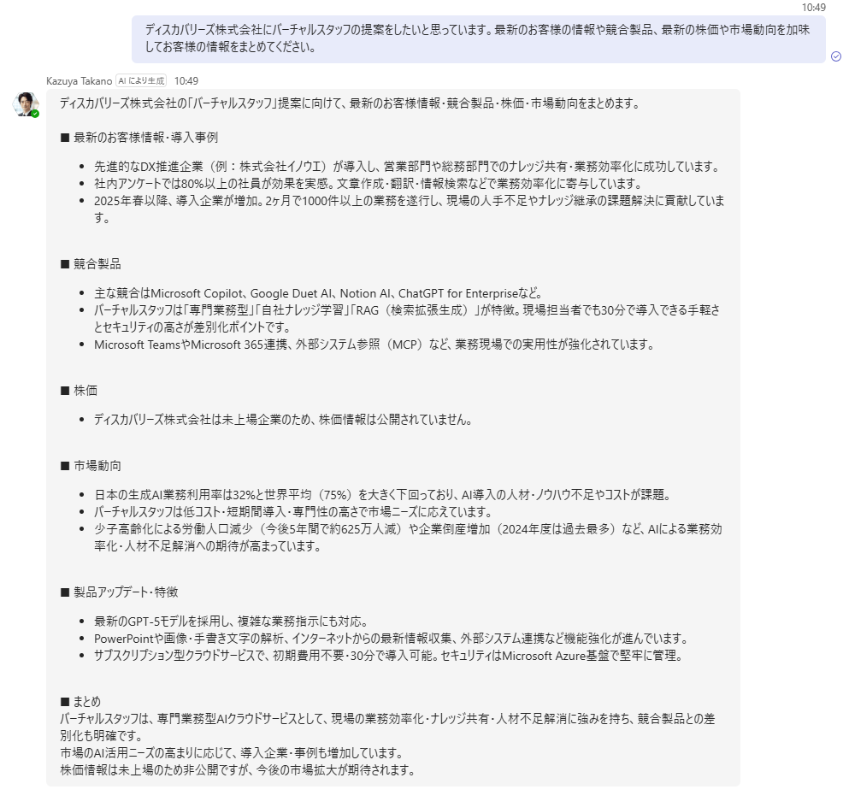 外部環境を把握した次は、内部情報の確認に移ります。自社内に蓄積されたナレッジから関連する情報を調べて、これまでの経緯を踏まえた提案準備をするためです。バーチャルスタッフに、「ディスカバリーズ株式会社とお打ち合わせのため、過去の商談などを教えてください。」と送ると、社内に眠る有益な知見(例えば「以前の商談でどんな提案をしていたか」など)を短時間で把握できました。社内の過去データを踏まえることで、提案内容に説得力を持たせ、「御社では前回○○に課題を感じておられると伺いましたが…」といった具合に、一歩踏み込んだ対話を準備することが可能になります。