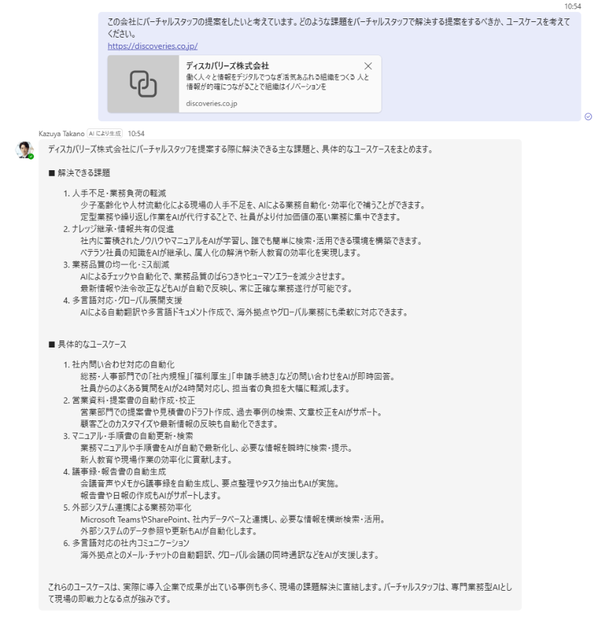 バーチャルスタッフに「この会社にバーチャルスタッフの提案をしたいと考えています。どのような課題をバーチャルスタッフで解決する提案をするべきか、ユースケースを考えてください。」とお客様のコーポレートサイトの URL と一緒に送ると、仮説を含めた提案ストーリーを考えてくれます。