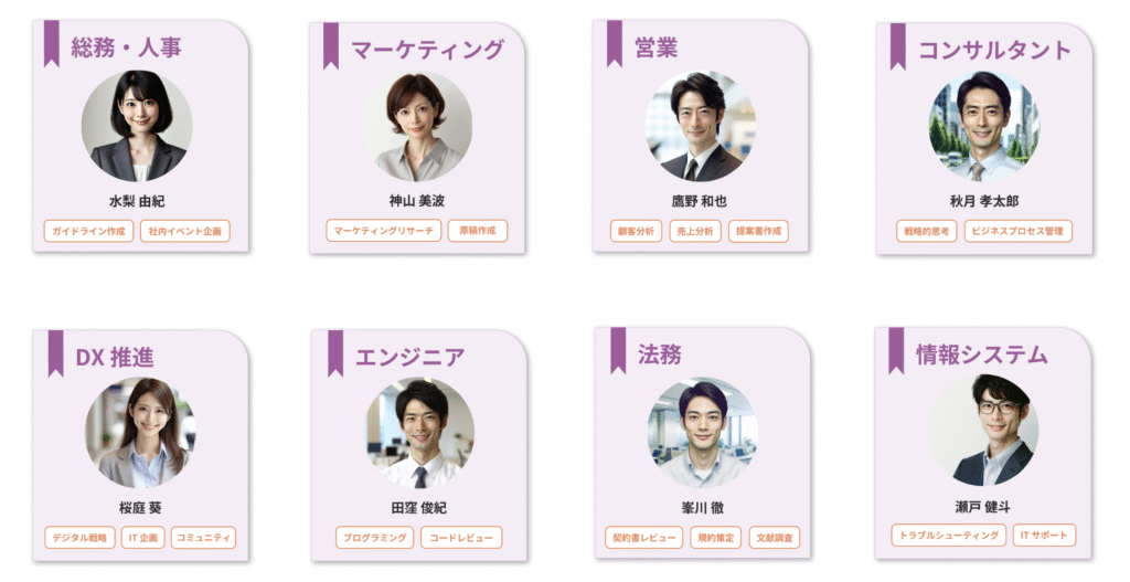 バーチャルスタッフは、総務や人事、営業など業務に特化したスキルを持つ、擬人化された AI エージェントです。SaaS 提供のため、複雑な構築なしに、人材不足に悩む現場業務へ即座に組み込めます。