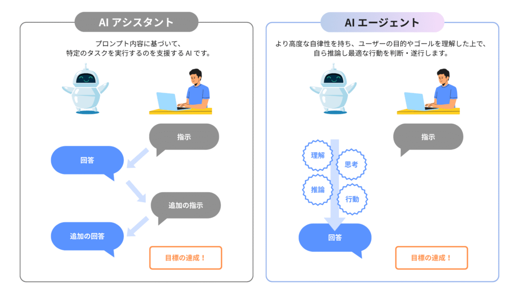 従来の 生成 AI は、ユーザーとの対話をベースに、段階的に目標達成を支援するアシスタント的な存在です。ユーザーが指示を出し、それに応答・提案を返すことで、会話を重ねながら目標に向けニーズをすり合わせていきます。