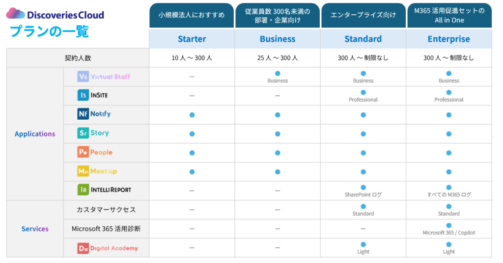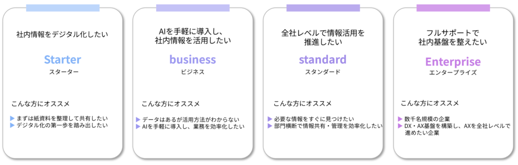 企業の規模や導入フェーズに応じて選べる4つのプラン(スターター/ビジネス/スタンダード/エンタープライズ)をご用意しています。